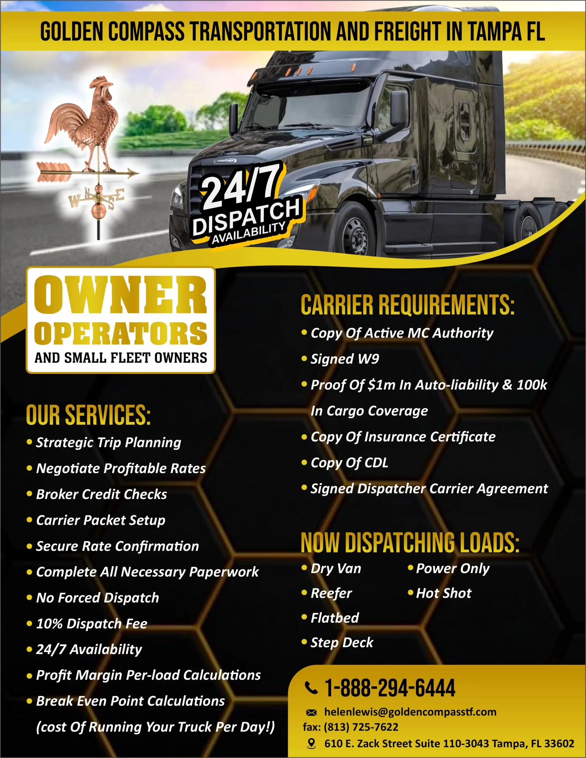 Golden Compass Transportation and Freight, LLC offers cross country cargo and local dispatching administrations for owner operators, independent carriers, and fleet owners with their own DOT/MC authority. We are devoted to finding the most worthwhile and compensating loads for every client ensuring a profit vs a break-even point. We approach each dispatching adventure as an exceptional chance to give consistent customized client service. We anticipate hearing from you.